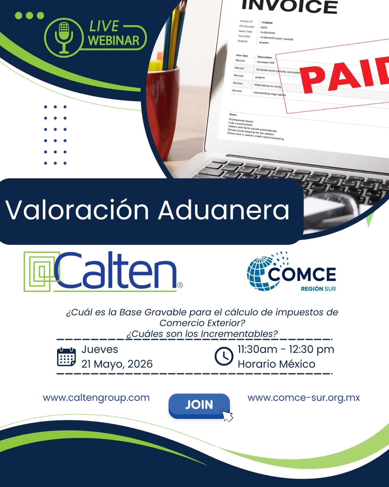 COMCE Sur en colaboración con Calten, te invita a participar en nuestro próximo Webinar: Valoración Aduanera.